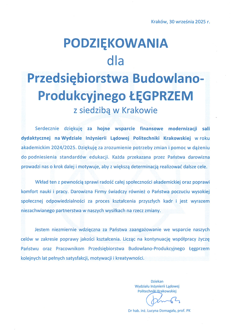 Z przyjemnością informujemy, iż w ramach naszej współpracy z Politechniką Krakowską sfinansowaliśmy i wykonaliśmy modernizację sali dydaktycznej w budynku dydaktyczno-laboratoryjnym Wydziału Inżynierii Lądowej, przy ul. Warszawskiej 24 w Krakowie. Oficjalne otwarcie sali miało miejsce 30 września 2025 r.
