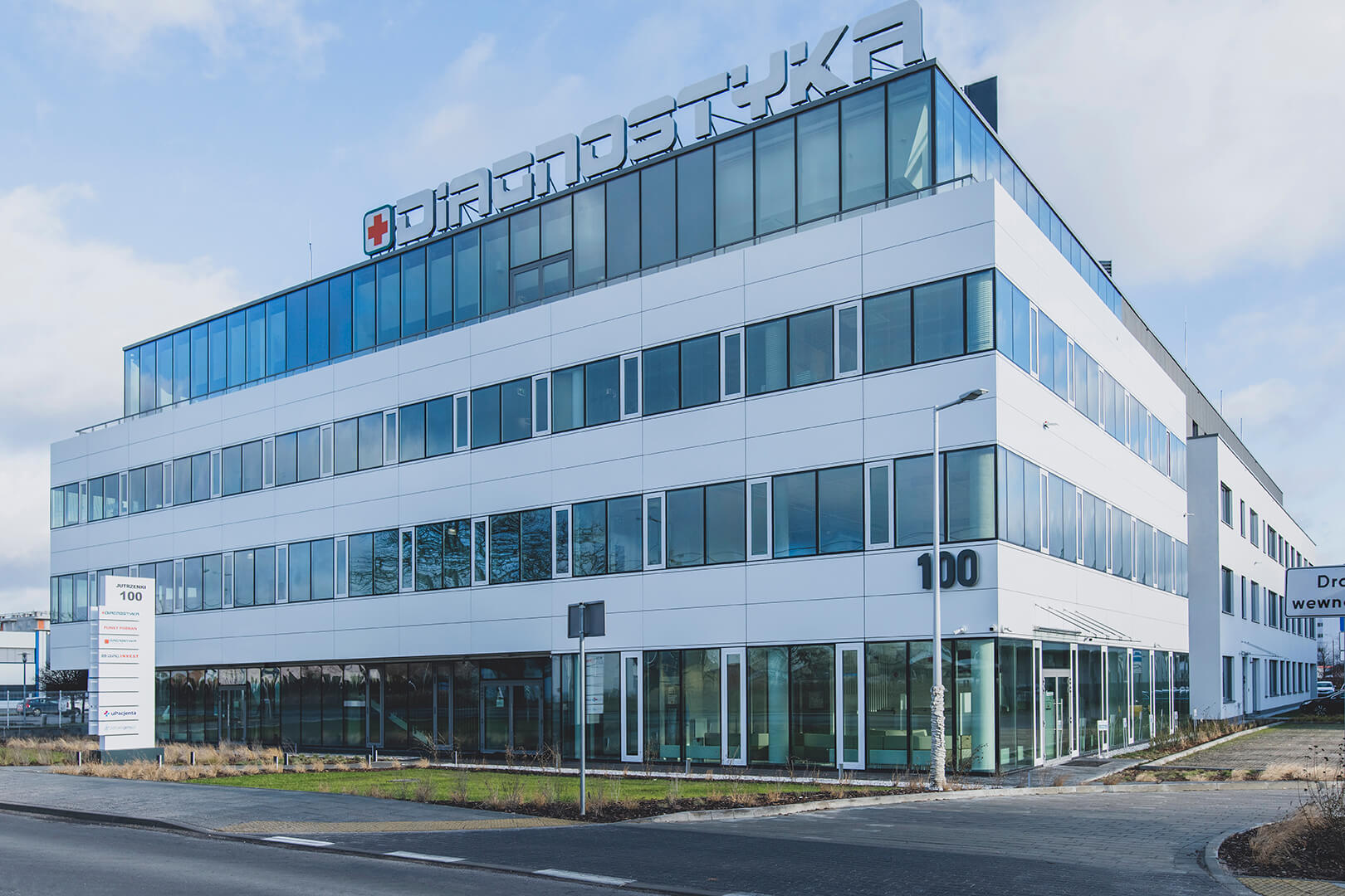 Budowa budynku usługowego z usługami laboratoryjnymi, biurowymi i medycznymi Diagnostyki w Warszawie przy ul. Jutrzenki 100 to kompleksowa realizacja wraz z instalacjami, w tym instalacją wentylacji mechanicznej, obsługą komunikacyjną, infrastrukturą, zagospodarowaniem terenu oraz miejscami postojowymi. Obiekt ma cztery kondygnacje nadziemne oraz jedną kondygnację podziemną. Jest to jedno z największych laboratoriów diagnostycznych w Europie środkowo-wschodniej. Program funkcjonalny budynku to: